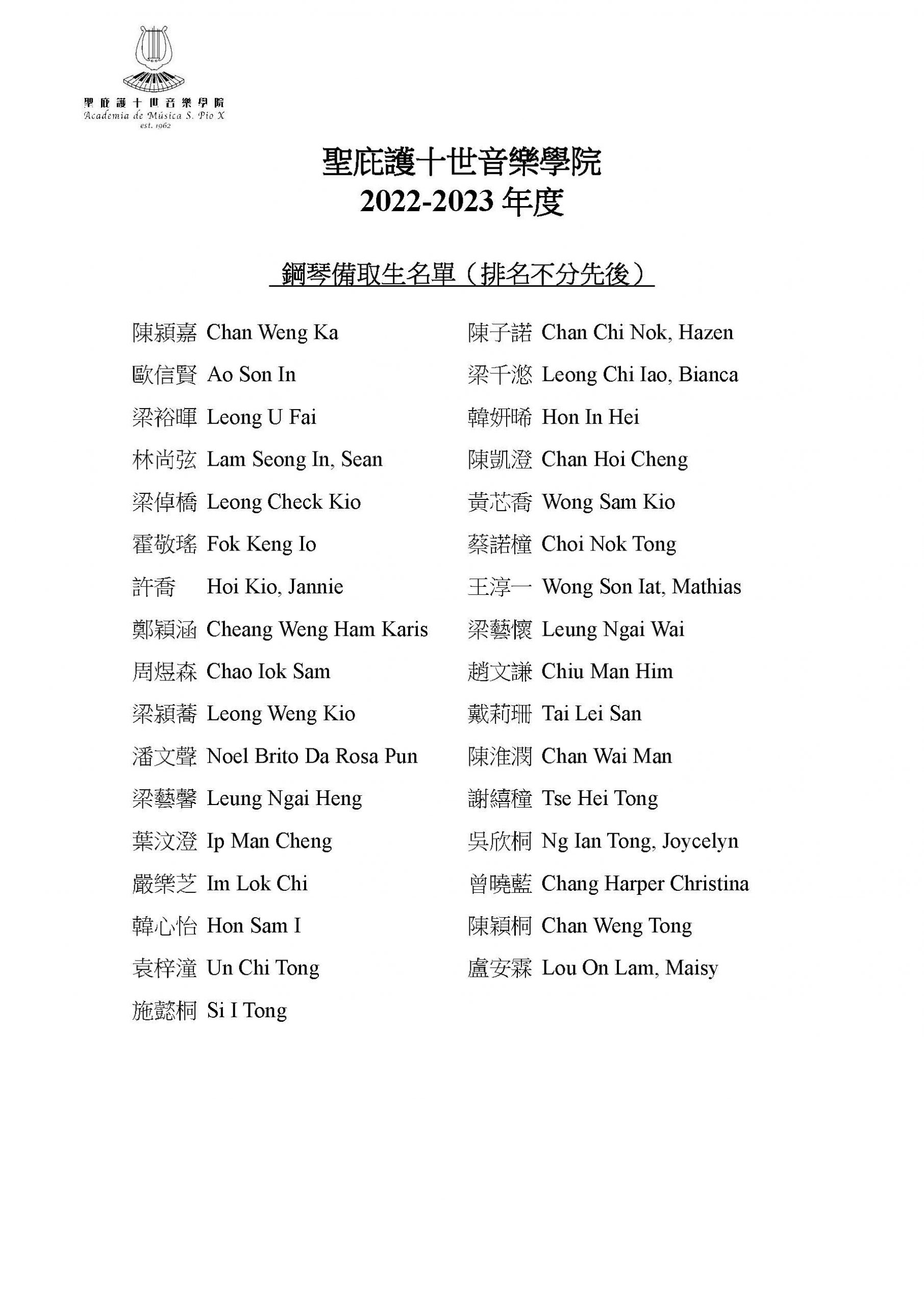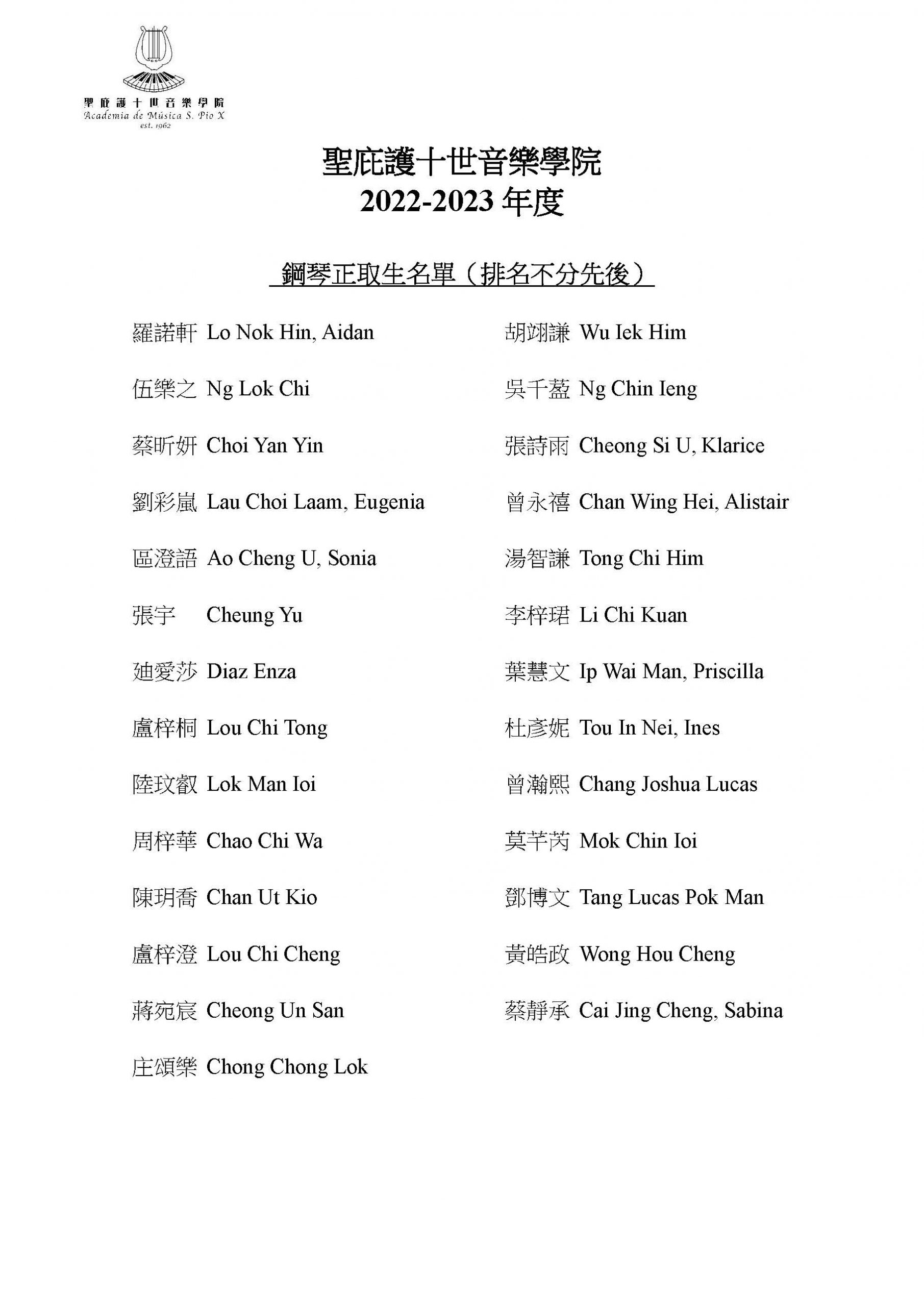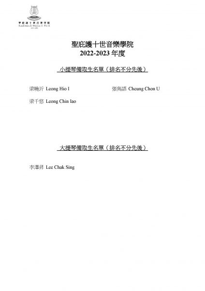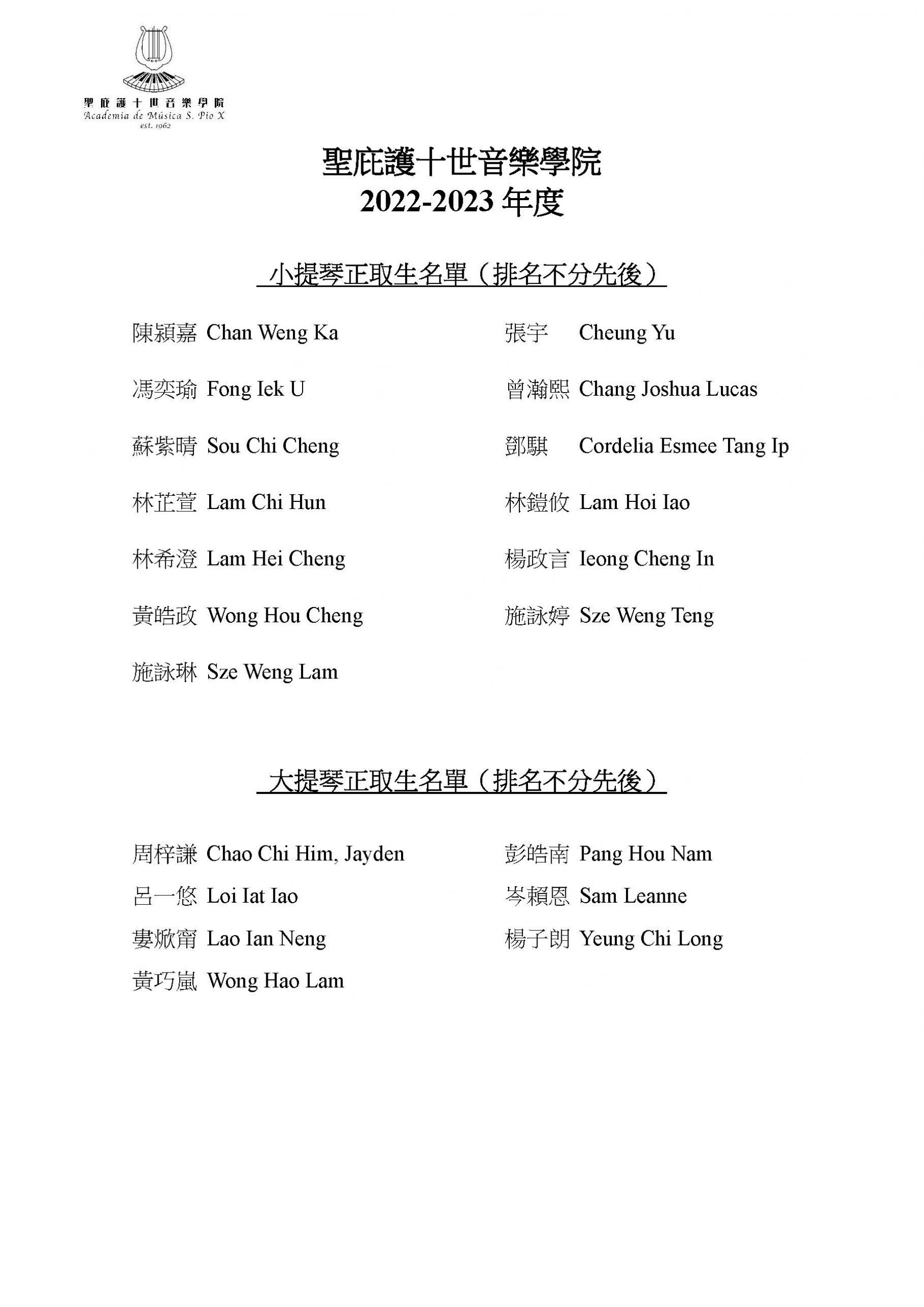 2022/2023學年新生正取生及備取生名單公佈