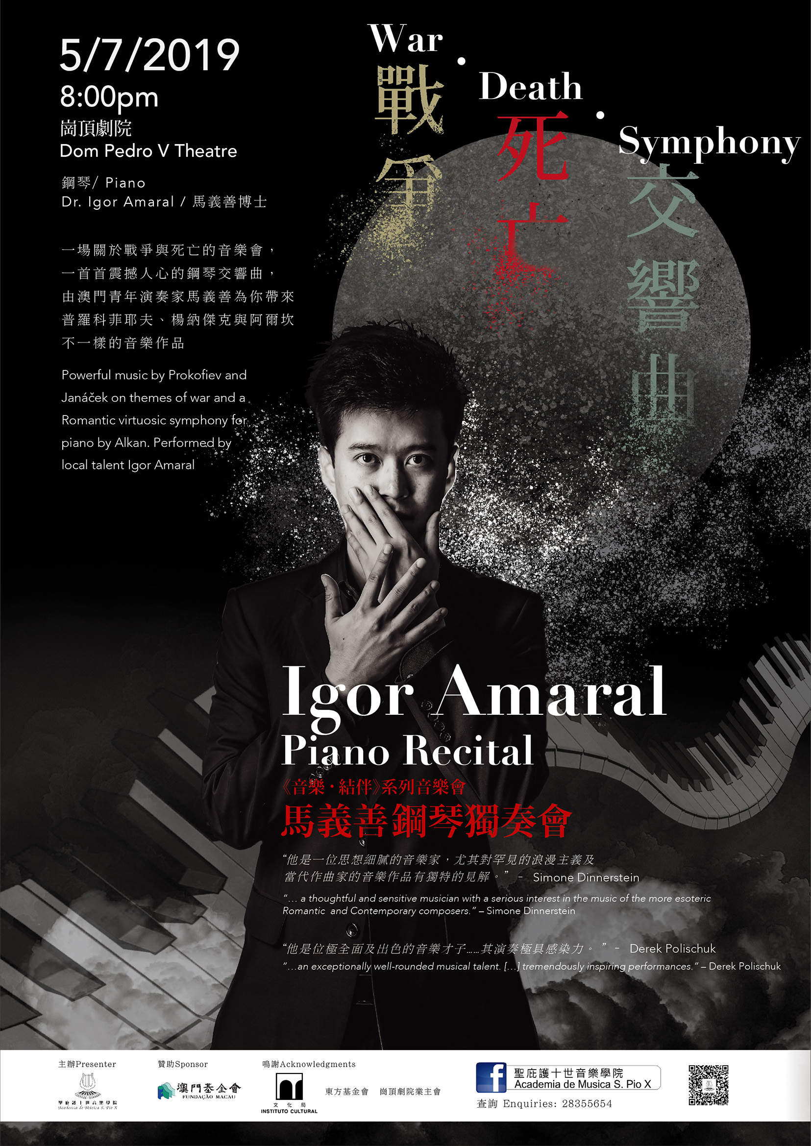 首場《戰爭.死亡.交響曲》鋼琴獨奏會是由聖庇護十世音樂學院校友兼老師馬義善(Igor Amaral)演奏。他畢業於美國密歇根州立大學鋼琴演奏的音樂藝術博士學位,曾獲得多個獎項及殊榮。其演奏足跡遍及北美、歐洲、亞洲,以及在多個著名音樂廳演奏。他尤其對罕見的浪漫主義及當代作曲家的音樂作品有獨特的見解,演奏富有感染力。在教學方面,馬義善曾是美國密歇根州立大學社區音樂學院鋼琴系導師,並在美國Interlochen藝術中心擔任教職。此外,他多次獲美國音樂教師協會和密歇根音樂教師協會邀請舉辦大師班及演講。是次音樂會中,他挑選了一些特別的曲目,有俄羅斯作曲家普羅科菲耶夫、捷克作曲家楊納傑克及法藉猶太裔作曲家阿爾坎的鋼琴作品,相信部分曲目更是首次於澳門演出。音樂會於7月5日(星期五)晚上八時假崗頂劇院舉行,不容錯過。
