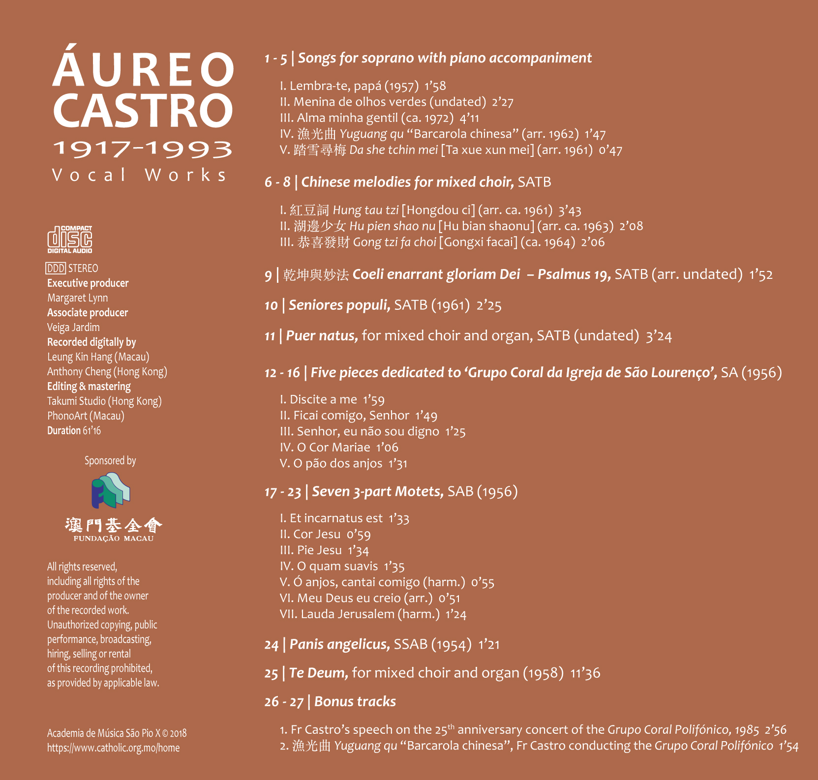 區師達神父是本澳最具影響力的音樂教育家、指揮家及作曲家,於1962年創辦本澳首間提供正規音樂訓練的音樂學府聖庇護十世音樂學院。為推廣區神父的音樂,聖庇護十世音樂學院歷經兩年籌辦及組織二百多位合唱者、聲樂家、管風琴家、指揮家、合唱團導師、錄音工程師等參與錄製《區師達神父聲樂作品》專輯,並於昨日舉行專輯發佈會儀式,以贈送方式發行1000張包含區神父所創作25首音樂作品及2段致詞錄音的專輯,期望透過光碟製作,讓更多人認識區神父在創作聲樂作品上的成就。
