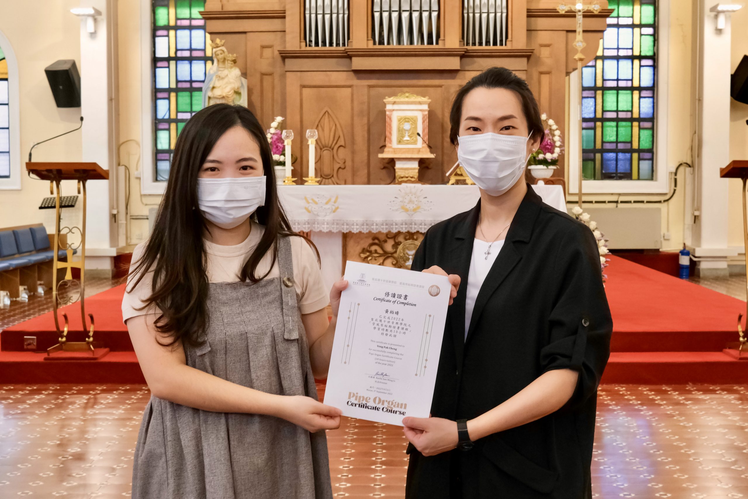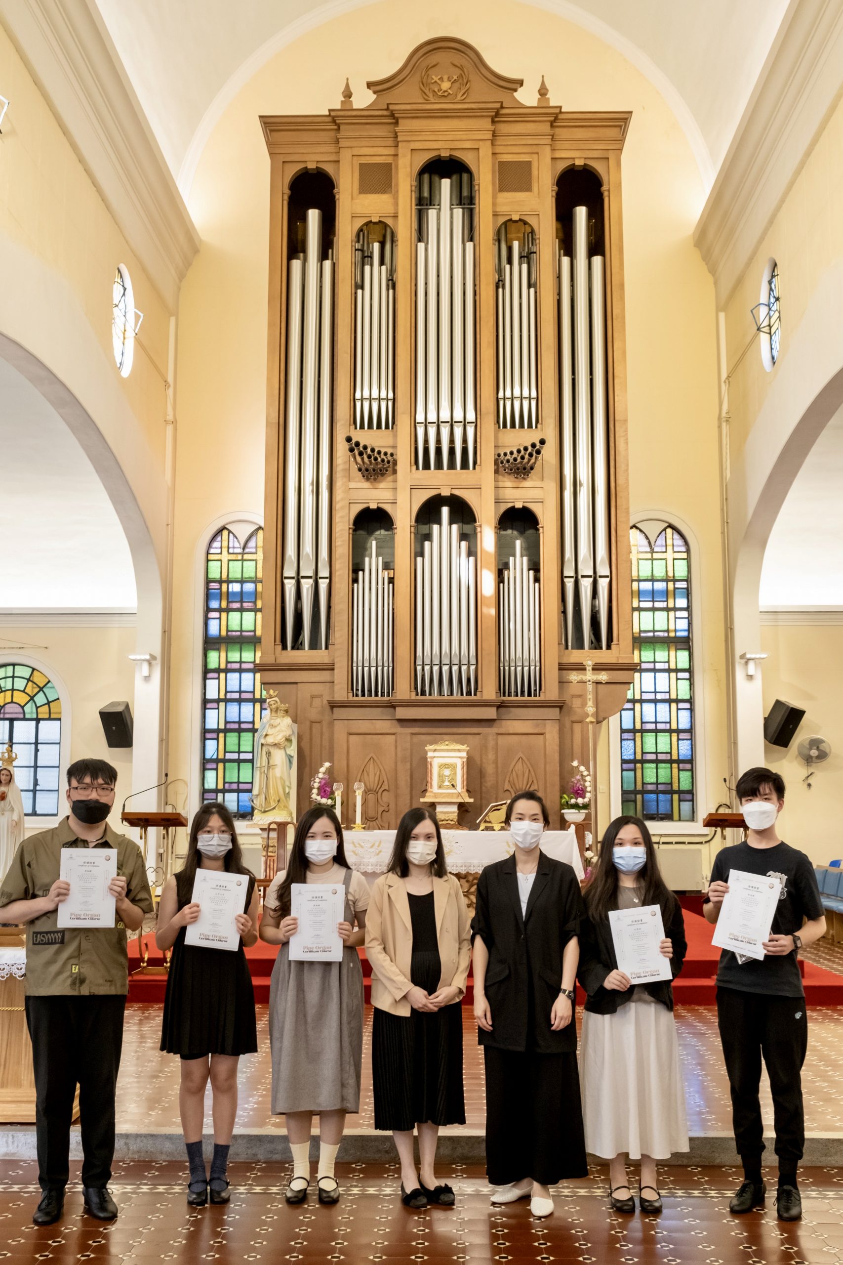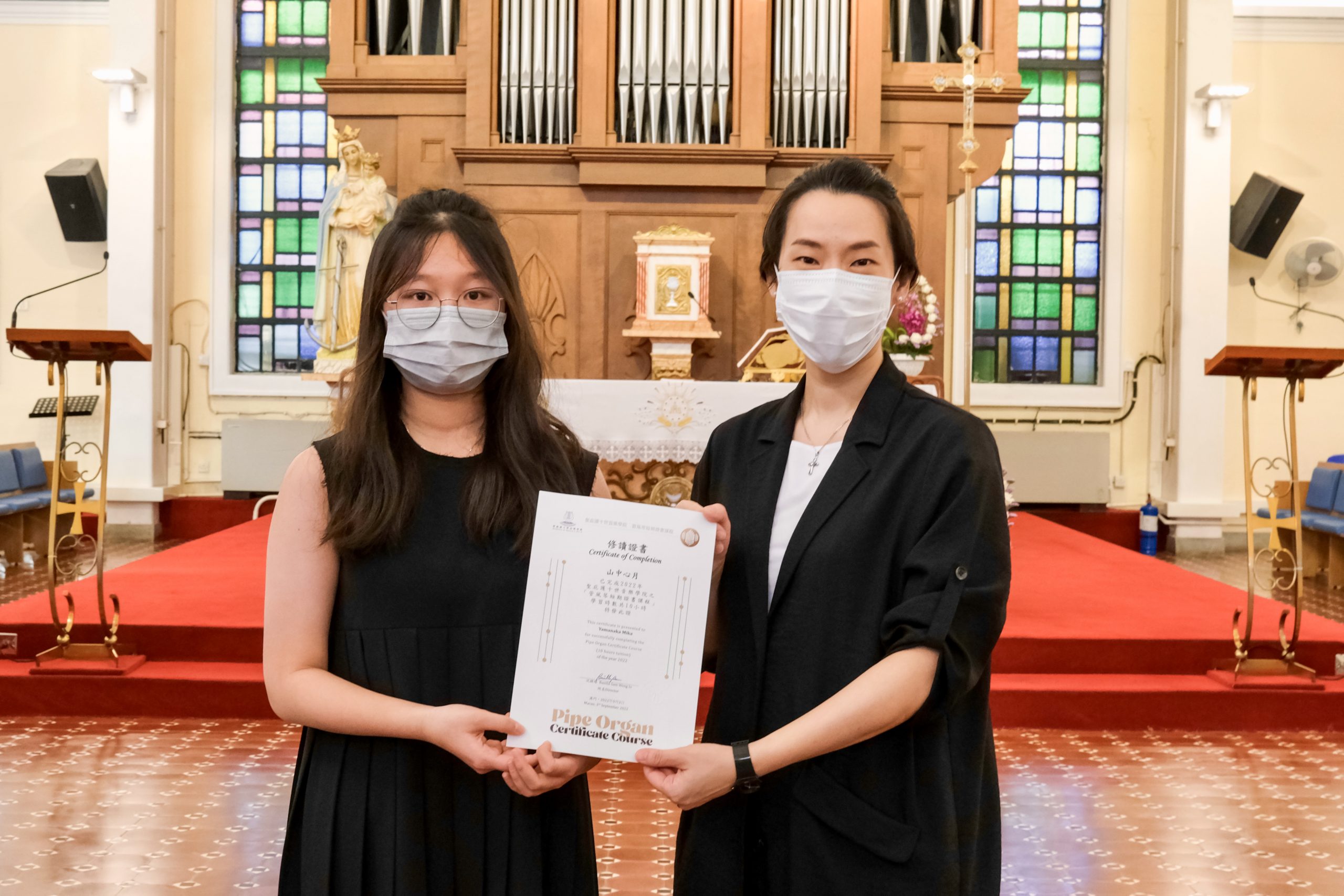 是次管風琴課程舉辦目的是希望藉此讓更多人認識及推廣管風琴音樂,以及培養更多司琴人才。上周六(9月3日)為課程最後一課,同時亦是學員之成果發表會。當日除了安排學員參觀望德聖母堂的管風琴之結構外,他們亦有機會首次在堂内、目前澳門最大的管風琴演奏,與家人親友分享展現學習成果。結業學員包括梁詠鏗、山中心月、黃柏晴、何霈婷及陳迪衠。導師蘇詠恩在作課程最後總結時表示,學員們在短短的時間內有如此演奏技巧,著實不易,讓人感動。其後由沈穎瑤院長為學員頒發證書,並勉勵學員繼續努力深化學習管風琴及相關知識,爭取更多機會演練。而這正是舉辦此課程去推廣澳門管風琴音樂發展的目的。最後,成果發表會於歡快的氣氛下結束。