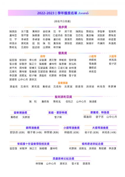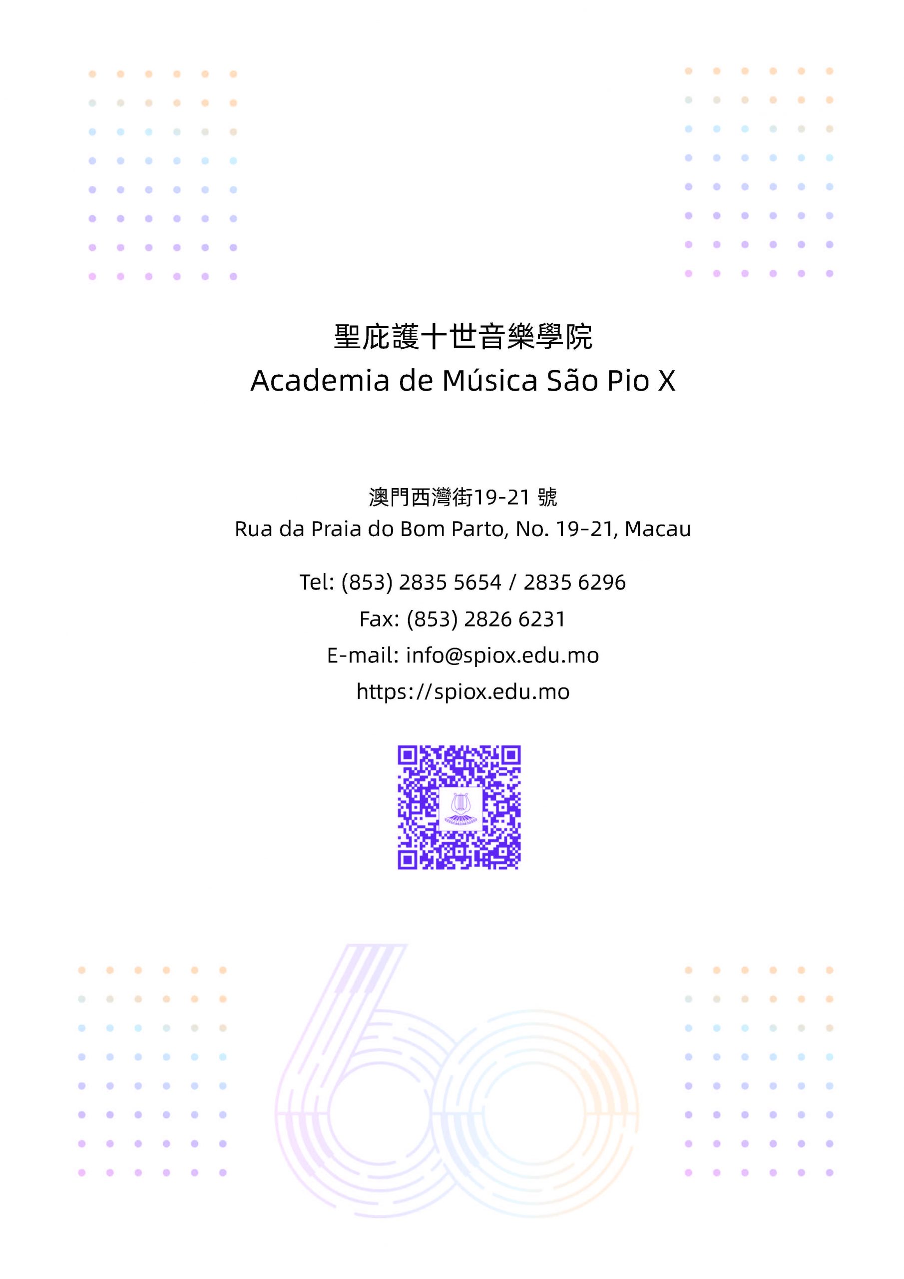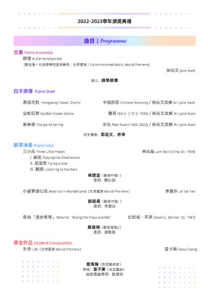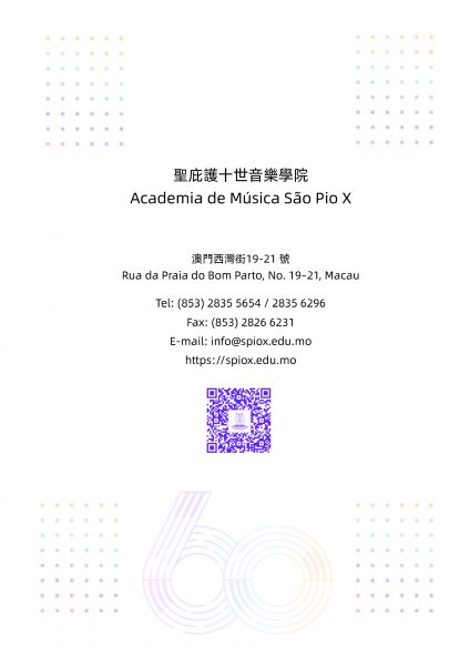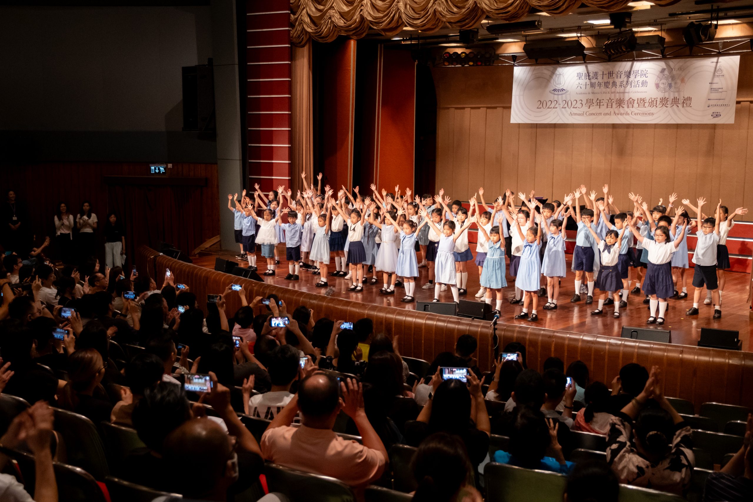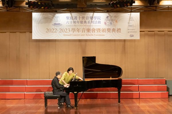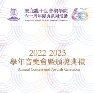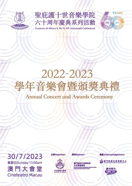 由天主教澳門教區主辦、聖庇護十世音樂學院舉行的《2022-2023學年音樂會暨頒獎典禮》於7月30日(上周日)上午十一時假澳門大會堂盛大演出。2022-2023學年為該院創院六十周年,是次音樂會為該學年最後一場活動,象徵著該學年畫上一個完滿句號,別具意義。