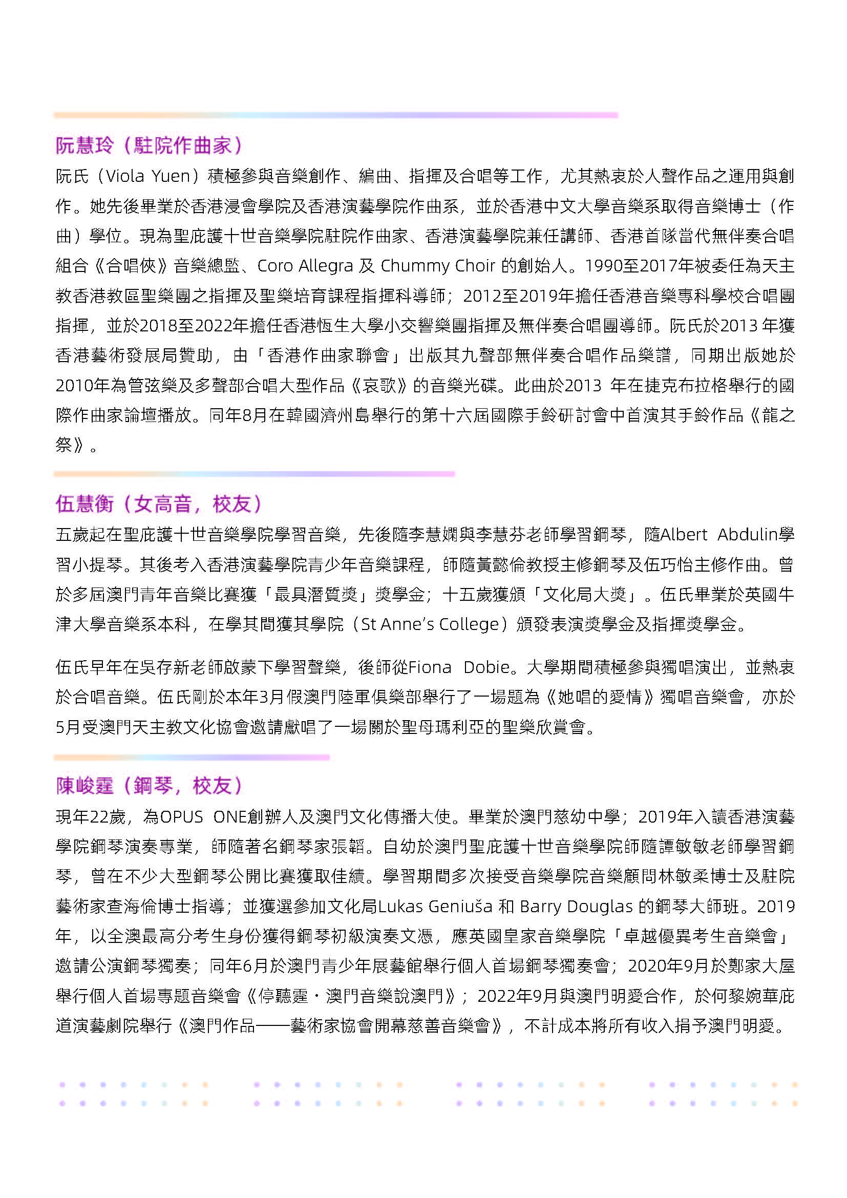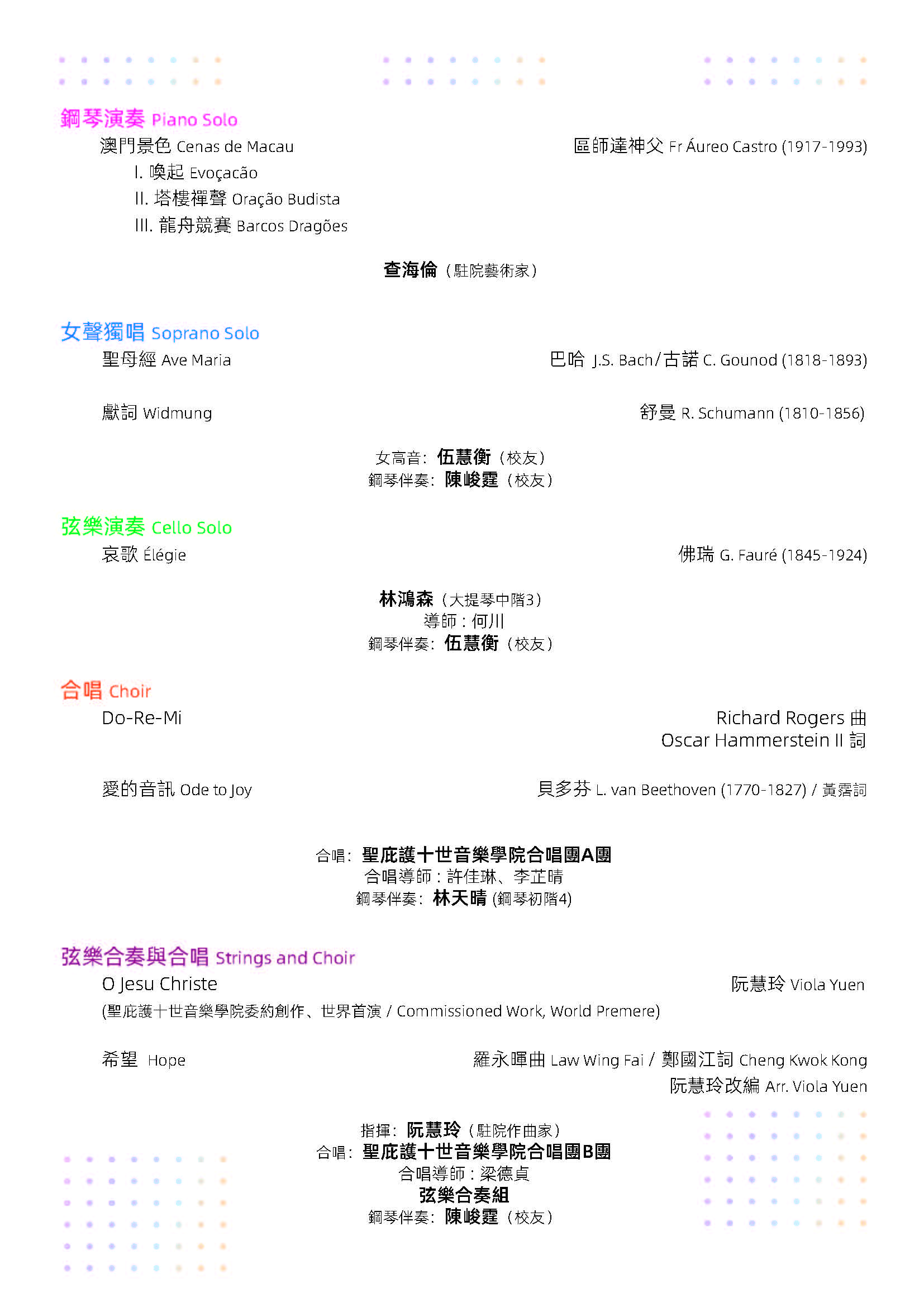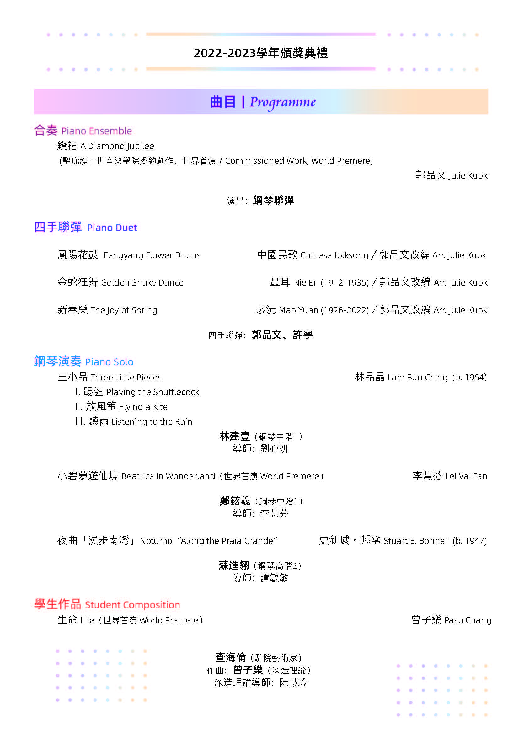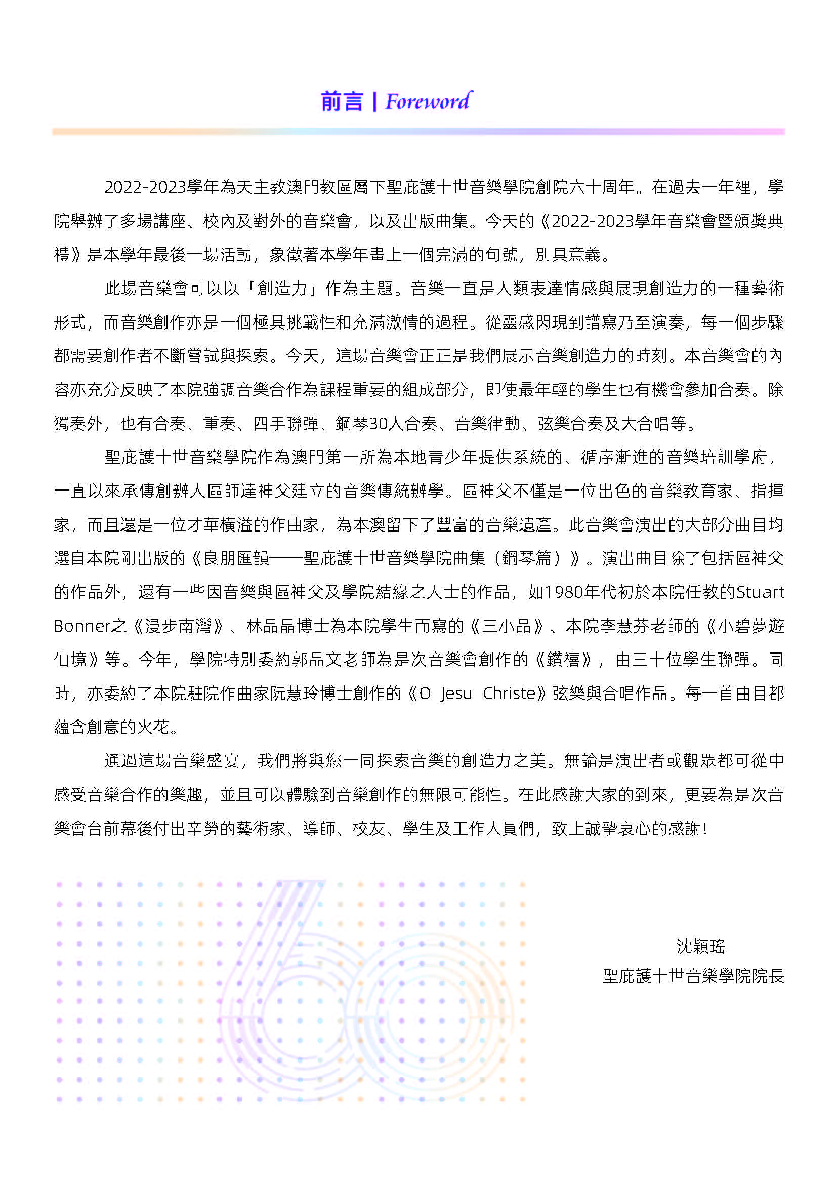 由天主教澳門教區主辦、聖庇護十世音樂學院舉行的《2022-2023學年音樂會暨頒獎典禮》於7月30日(上周日)上午十一時假澳門大會堂盛大演出。2022-2023學年為該院創院六十周年,是次音樂會為該學年最後一場活動,象徵著該學年畫上一個完滿句號,別具意義。