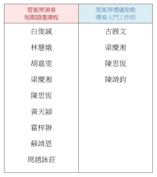 公佈管風琴短期證書課程錄取名單