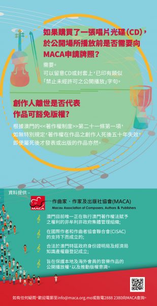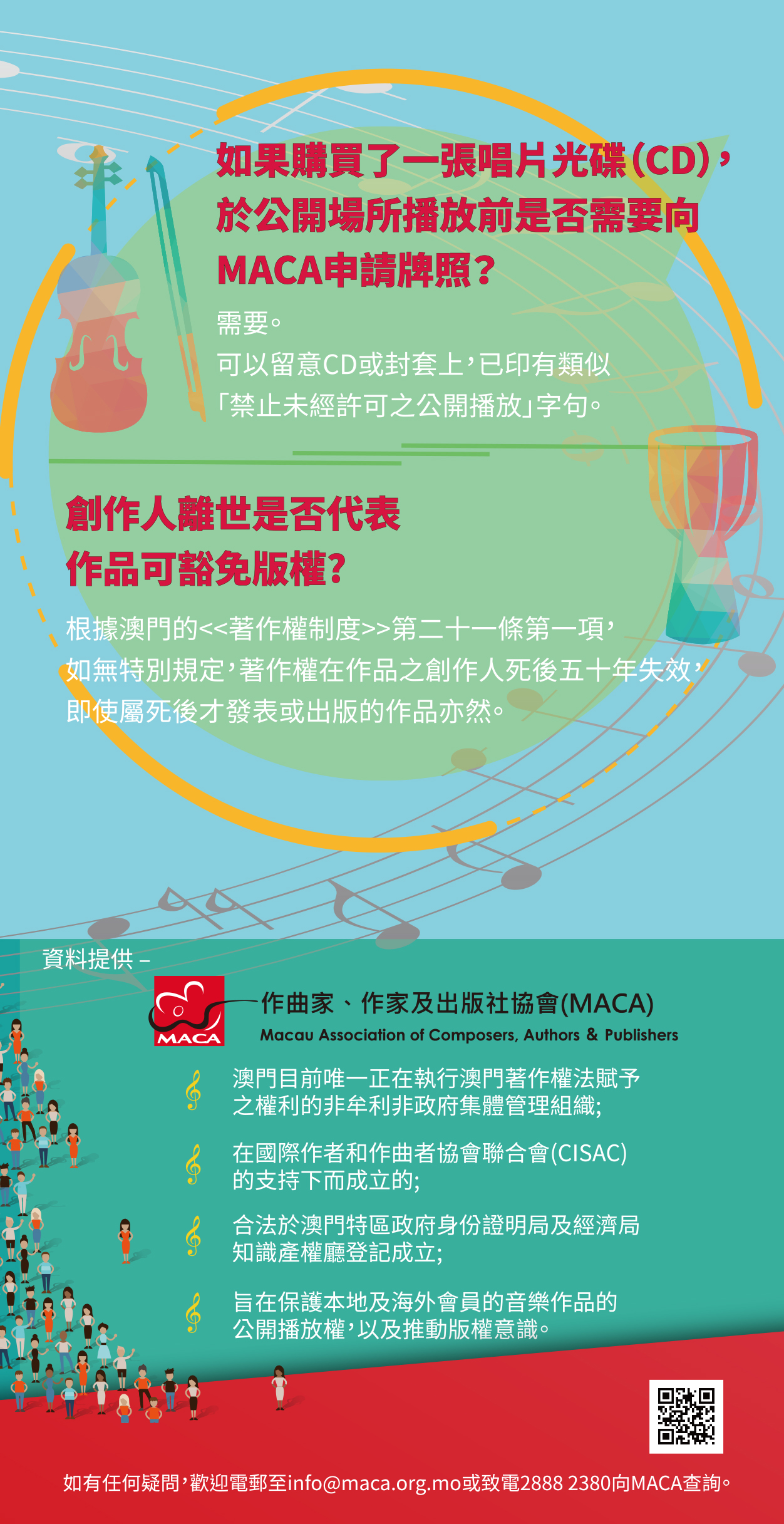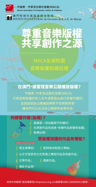 本院誠邀 作曲家、作家及出版社協會(MACA)於2020年10月17日(星期六)下午6時30分 舉行一場《音樂版權知識講座》,介紹有關音樂知識產權、版權的重要性以及受版權保護作品等等。