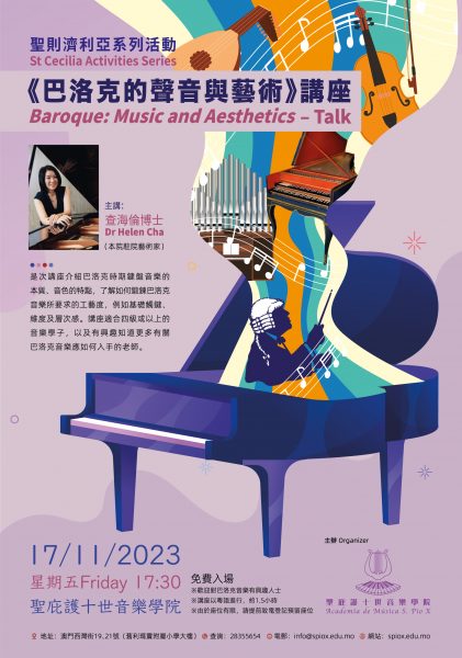 天主教澳門教區轄下聖庇護十世音樂學院將於11月17日(星期五)下午五時半在該院演奏廳舉辦“巴洛克的聲音與藝術"鋼琴講座,由香港知名音樂家查海倫博士主講,免費入場。 是次講座介紹巴洛克時期鍵盤音樂的本質、音色的特點,了解如