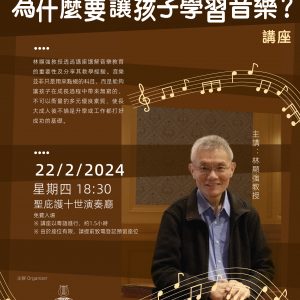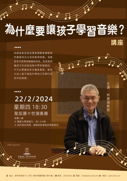 聖庇護十世音樂學院將於2月22月(星期四)下午六時半在該院舉行《為什麼要讓孩子學習音樂?》講座,由林顯強教授主講,免費入場。 音樂教育早在2500年前希臘古文明中已佔有非常重要的地位。希臘孩子在教育培訓方面主要有三個科目