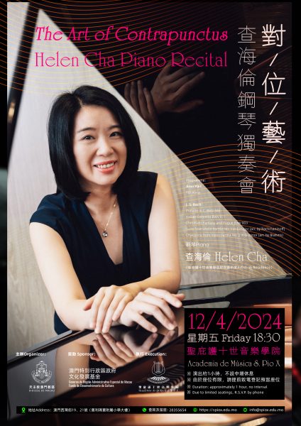《對位藝術—查海倫鋼琴獨奏會》將於4月12日(星期五)傍晚六時半在天主教澳門教區轄下聖庇護十世音樂學院該院演奏廳舉行,由香港知名音樂家查海倫博士擔任演出,免費入場。 是次音樂會查海倫博士將向聽眾分享對位藝術的獨特美感。除