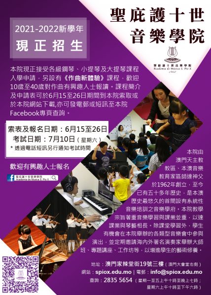 招生章程 聖庇護十世音樂學院於1962年由區師達神父所創立,是本澳第一所為青少年提供正規音樂培訓的學府。 本院注重音樂與藝術教育為全人教育中重要一環,透過學習音樂促進孩子的思考、推理、創作及表達能力,和發展與人合作、自信