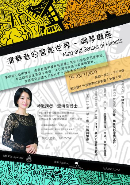 天主教澳門教區將於7月19至23日(星期一至五)一連五天下午六時在聖庇護十世音樂學院演奏廳舉辦“演奏者的官能世界”鋼琴講座,由香港知名音樂家查海倫博士主講,免費入場。 為何手指總是不夠靈活?為何認真練習總是彈不好?為何努