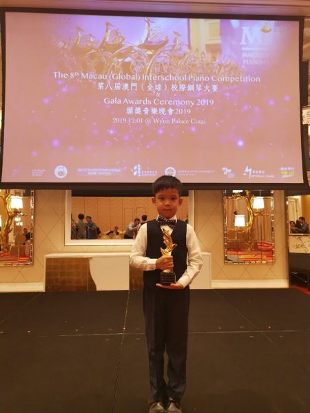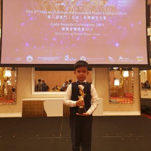 2019年12月11日 恭喜余梓睿同學於第八屆澳門(全球)校際鋼琴比賽中榮獲獎項 參賽學生:余梓睿 指導老師:龍志恆 賽事名稱:第八屆澳門(全球)校際鋼琴比賽 獲取獎項:小一組亞軍 主辦單位:澳門(全球)校際鋼琴比賽