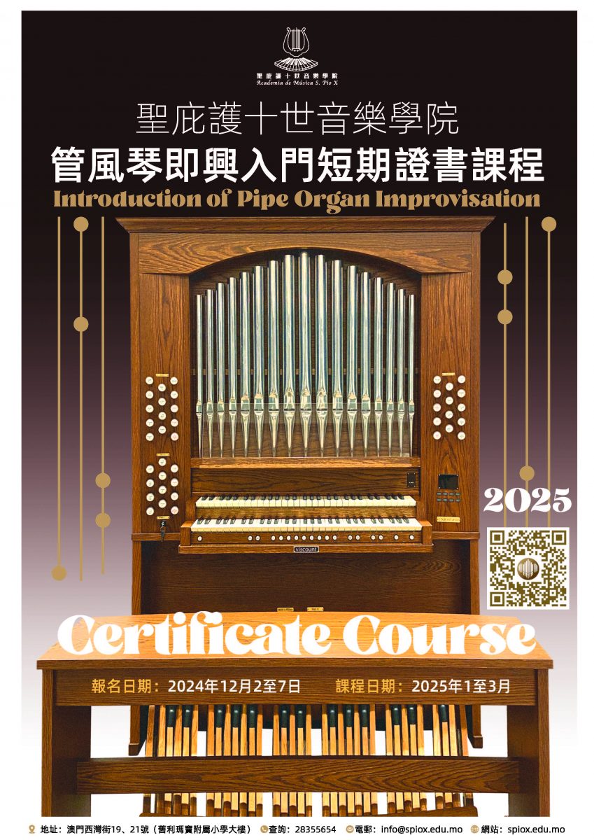 此課程專為現任司琴或對管風琴即興演奏有興趣的人士而設,亦歡迎沒有彈奏管風琴經驗者報名。管風琴「即興彈奏」是一項非常實用的技能,能促進和輔助禮儀的進行。在彌撒禮儀或婚禮禮儀中,司琴在多個情況下都需要即興演奏,例如在頌唱聖詠前的前奏、兩曲之間的間奏、曲後的後奏、配合禮儀動作的音樂或是靜默祈禱的伴奏等。課程導師將教導學員如何以傳統四聲部禮儀聖歌作為簡短即興的基礎,通過練習令學員在最短時間內撑握禮儀即興技巧和演奏竅門,豐富彌撒禮儀的氛圍,從而協助會眾投入禮儀之中。課程以集體課型式進行,合共6.5小時。